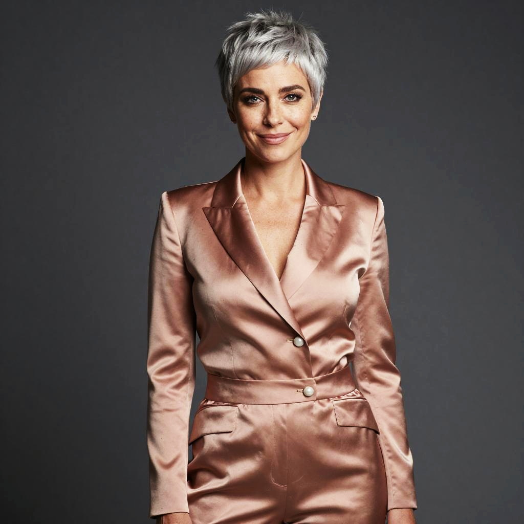 A woman with a silver pixie cut and delicate freckles, adorned in a tailored rose-gold satin pantsuit with subtle pearl buttons. With a confident smile, she gazes directly at the lens, exuding elegance.