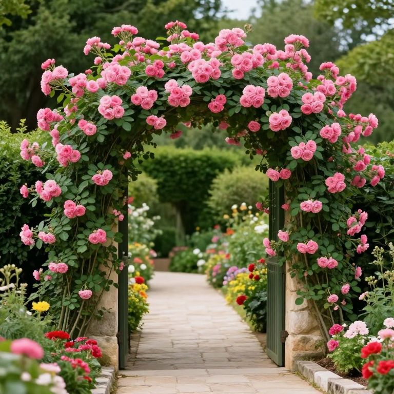 Pink climbing roses gracefully arch over a stone pathway, creating a romantic garden entrance framed by lush greenery and bordered by vibrant flowerbeds in a serene outdoor setting reminiscent of Provence, France.