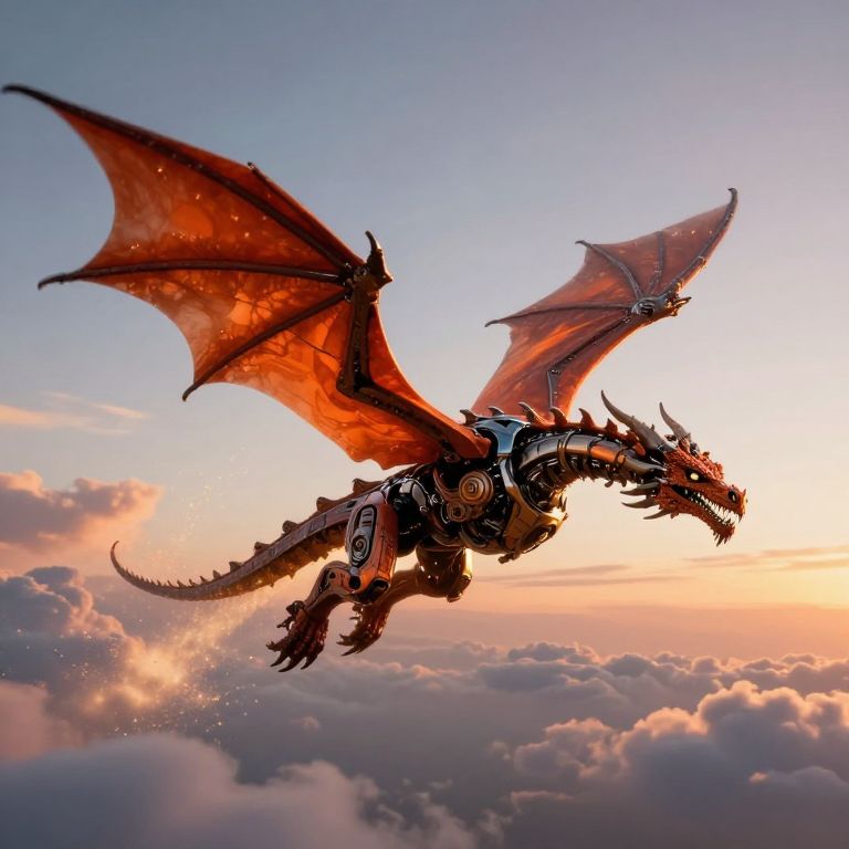 Photorealistic digital art of a mechanical, red-orange dragon with large wings soaring through a sunset sky amidst fluffy clouds.