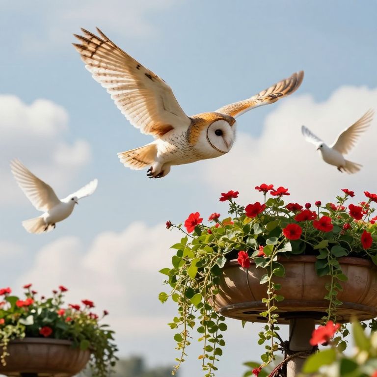Owls soar gracefully above vibrant floating gardens, their wings spread wide as they tend to lush green planters adorned with cascading vines and blooming red flowers, while white doves flutter around them against a serene sky dotted with fluffy clouds.