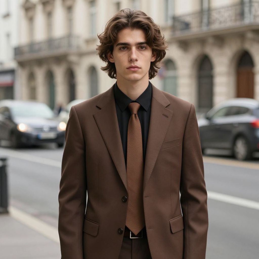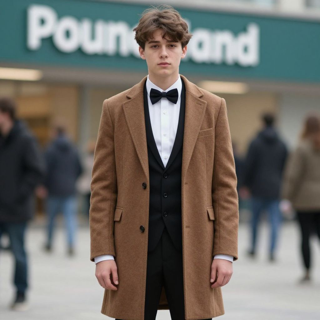 "poundland fancy dress, 1boy, male focus, solo, pants, necktie, bow, shirt, black pants, vest, looking at viewer, brown hair, white shirt, bowtie, blurry background, coat, jacket, standing, closed mouth, collared shirt, realistic, blurry, brown coat, suit, formal, long sleeves Realistic photo of casual sexy person with pretty face"