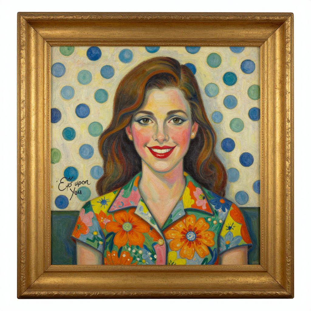 Vibrant portrait painting of a smiling woman with red lipstick, brown wavy hair, floral shirt, and blue polka dot background, in an