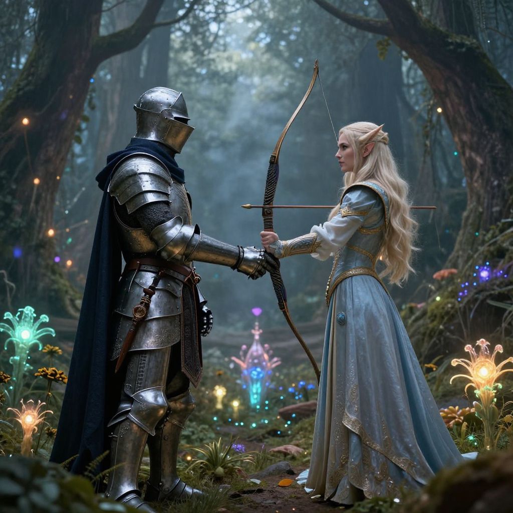 Photorealistic digital art depicting a medieval forest scene. A knight in shiny, silver armor with a black cloak stands facing a blonde elf woman in a flowing, silver gown adorned with intricate gold embroidery. She holds a glowing, ornate bow, while he extends his hand. The forest is lush with tall trees, misty light filtering through, and colorful, bioluminescent flowers dotting the ground. The elf has delicate, pointed ears and a serene expression, while the knight's face is obscured by his helmet. The scene is enchanting and mystical, filled with magical ambiance.