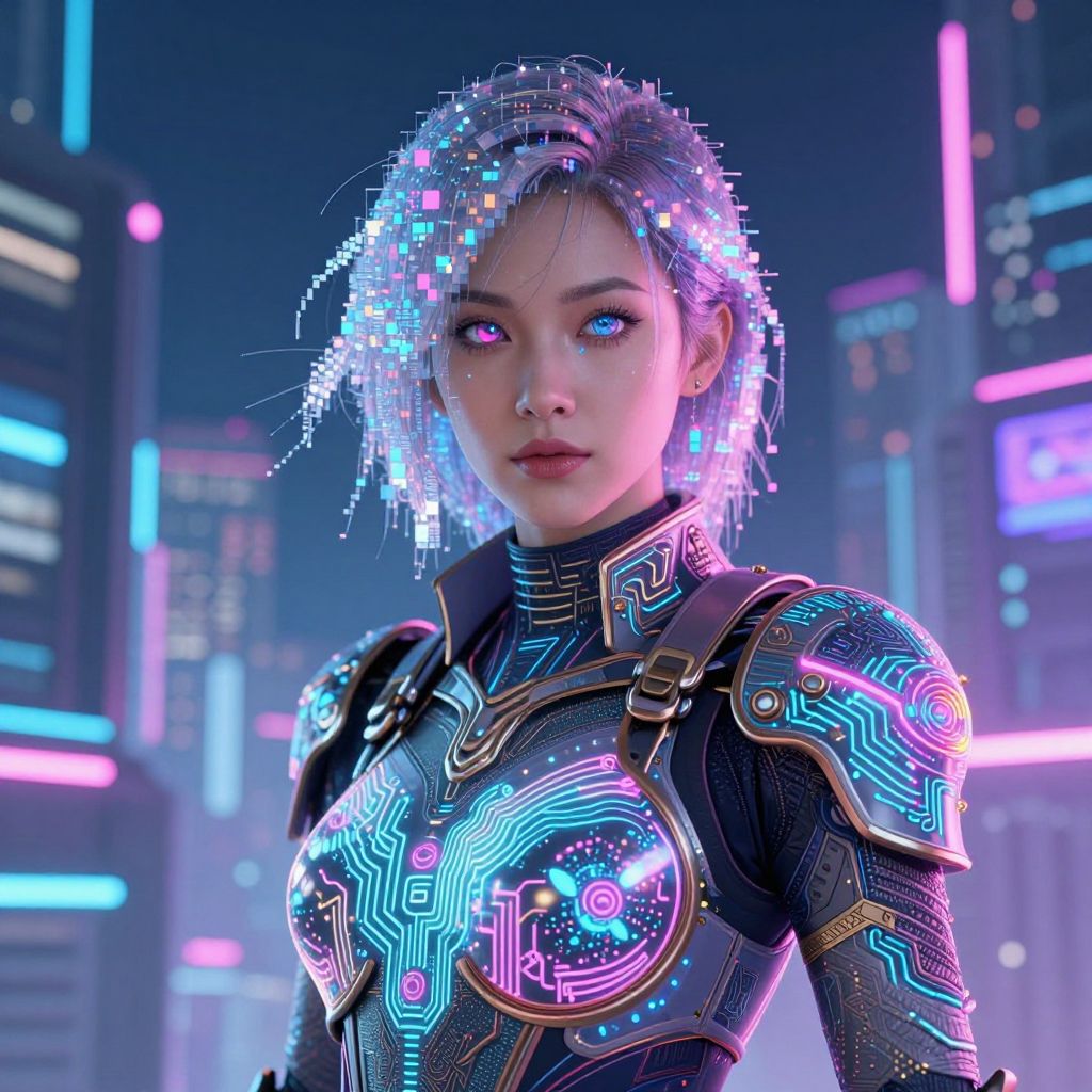 A hyper-realistic CGI image of an Asian woman with glowing purple and blue eyes, wearing futuristic, neon-lit armor with intricate circuit patterns. Her silver, cybernetic hair is adorned with tiny, illuminated pixels. The background is a neon-lit cityscape at night, with blurred, colorful skyscrapers and glowing signs. Her expression is serious, and the armor highlights her athletic build. The image blends sci-fi and cyberpunk aesthetics, with vivid, luminescent colors and detailed textures.