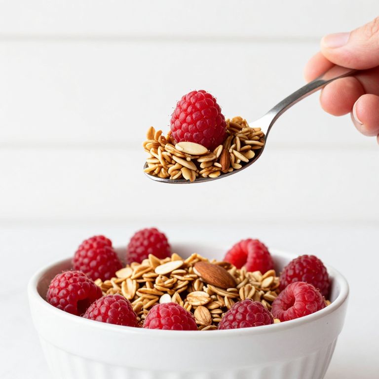 Spoonful of vegan almond granola and a vibrant red raspberry held above a white ceramic bowl filled with granola and fresh raspberries, set against a clean white shiplap backdrop.