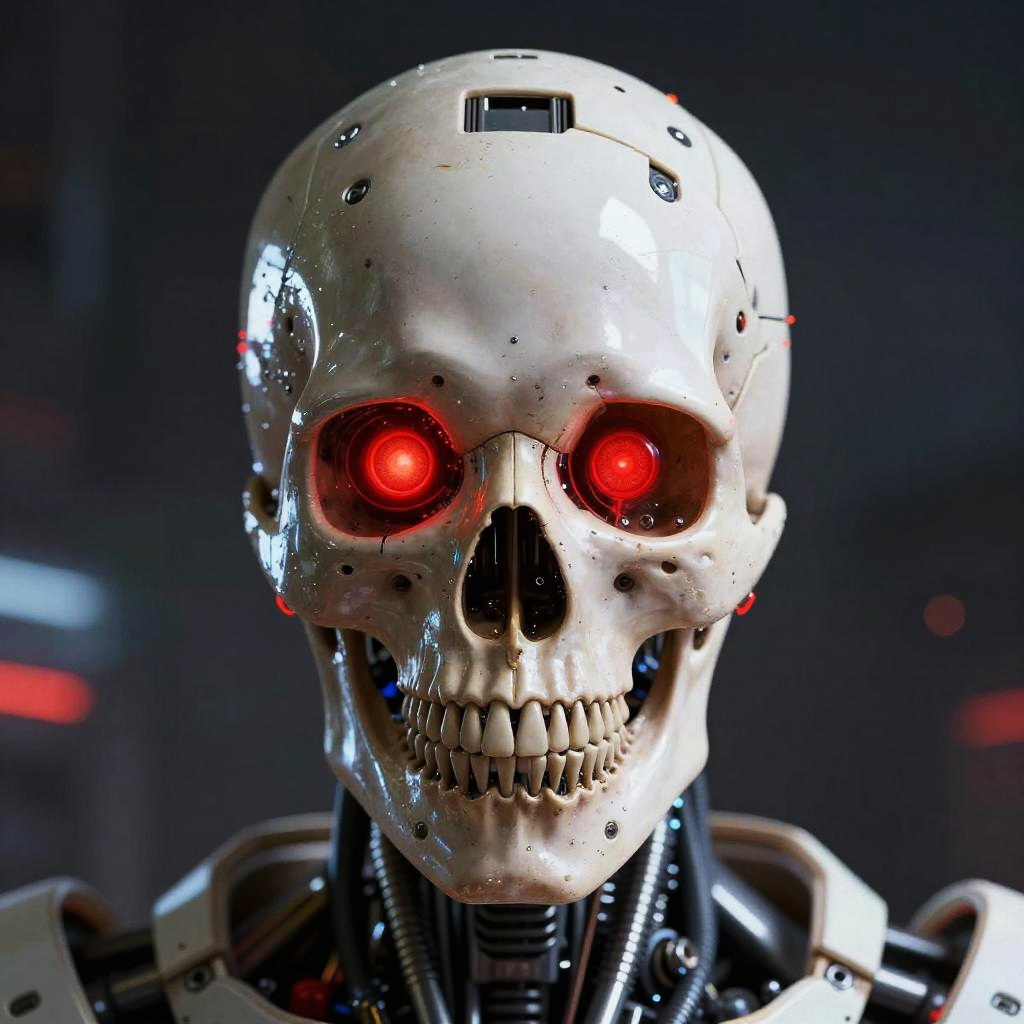 Front facing skull with mechanical cybernetic enhancements, glowing red eyes, futuristic dystopian background, sharp metal and bone contrast, digital art style