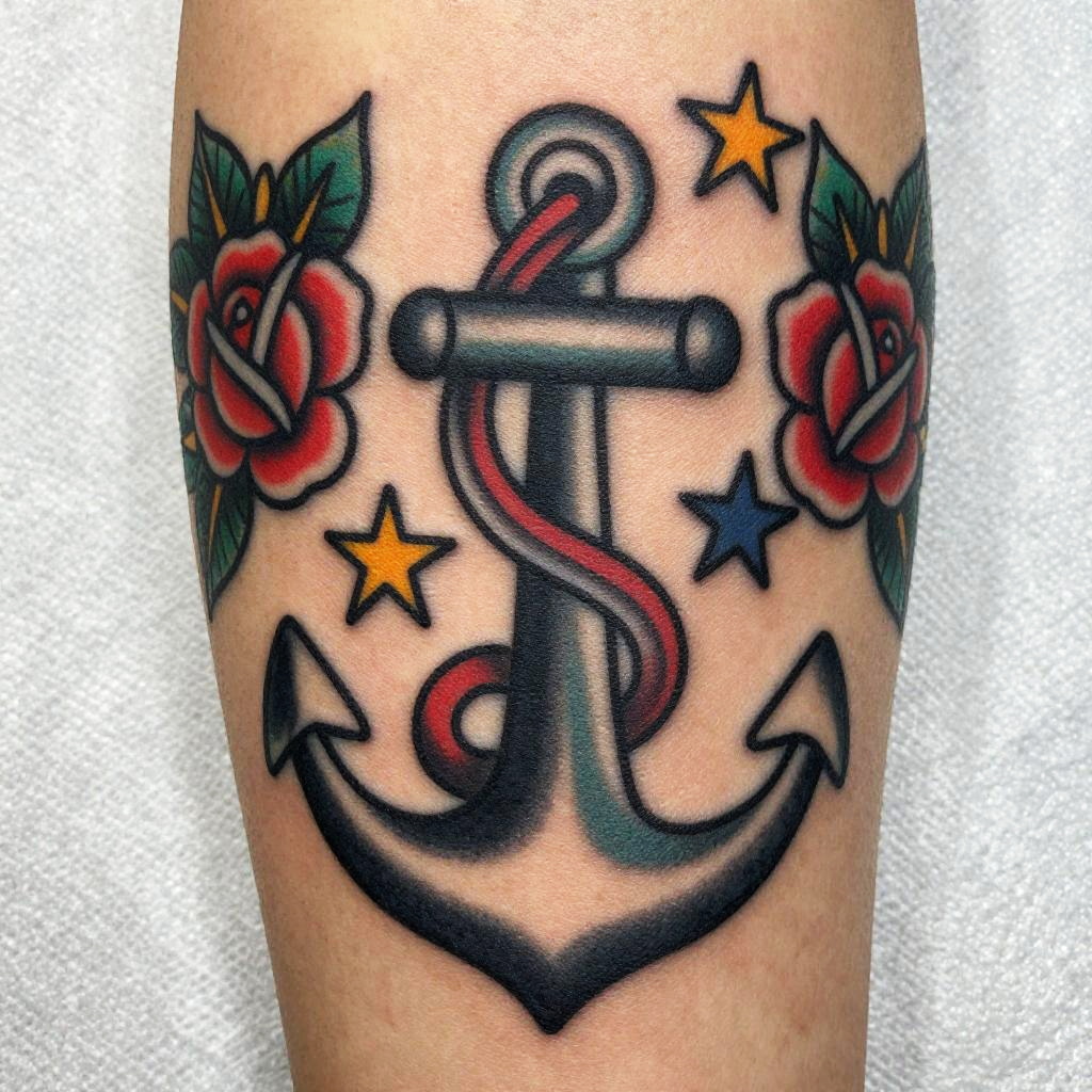 Tattoo of a black anchor with red spiral, surrounded by red roses, green leaves, and yellow stars on skin.