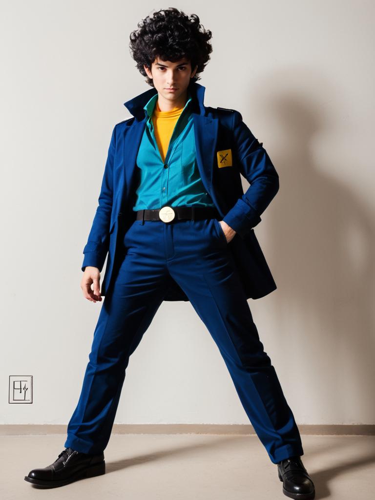 Full-body portrait of a young man with curly black hair dressed in a detailed cosplay costume of Spike Spiegel from the anime Cowboy Bebop. He is wearing a blue suit with a matching trench coat, a teal shirt over a yellow undershirt, black belt with round buckle, and black shoes. The man poses confidently against a simple white background.