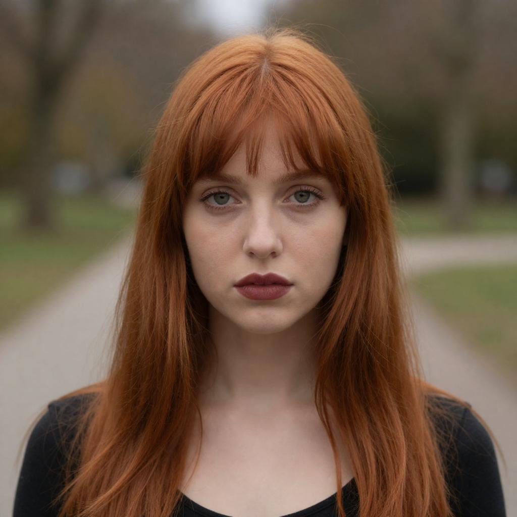 Photograph of a young woman with long, straight, vibrant red hair and bangs, standing outdoors. She has fair skin, green eyes, and wears dark lipstick. The blurred background features a grassy path and trees. She gazes directly at the camera with a neutral expression.