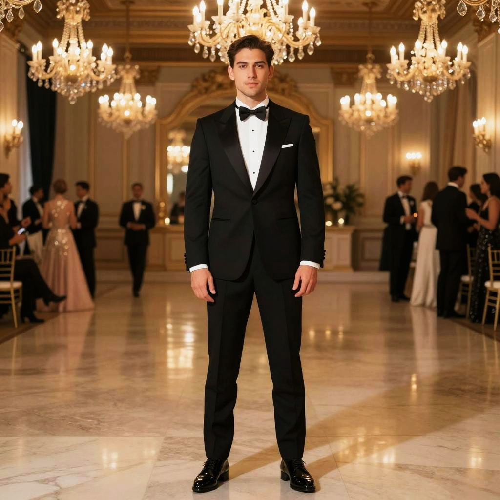 A stylish man stands confidently in a formal black tuxedo, exuding elegance and charm. The sophisticated setting features ornate chandeliers and a polished dance floor, creating a perfect backdrop for a glamorous evening event.