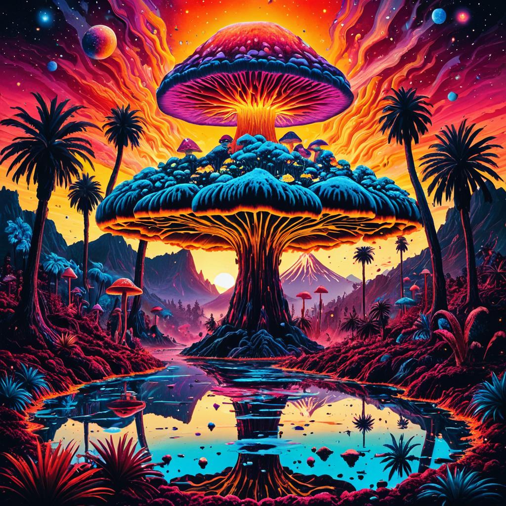 Surreal digital artwork of a melting mushroom forest with large glowing mushrooms set on a vibrant bismuth-colored alien planet. The scene features palm trees, erupting volcanoes, kaleidoscopic stars, and liquid nebulas under a colorful glowing sunset sky. A reflective water body in the foreground mirrors the psychedelic landscape, creating a vivid and fantastical environment.