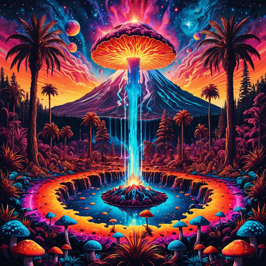 Psychedelic melting mushroom forest on a colorful glowing bismuth planet with liquid nebulas, palm trees, erupting volcanoes with sunset colors, waterfalls, melting landscape, kaleidoscopic stars, vibrant sunset hues
