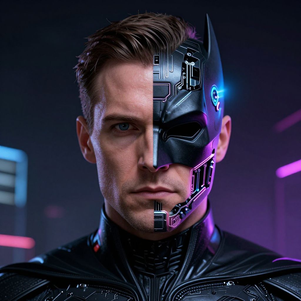 Bruce Wayne AI art concept, merging human and machine elements, half face as a realistic billionaire, half face as a robotic bat-inspired mask, intricate circuit patterns glowing softly, Gotham bat signal subtly integrated, high contrast with futuristic neon hues