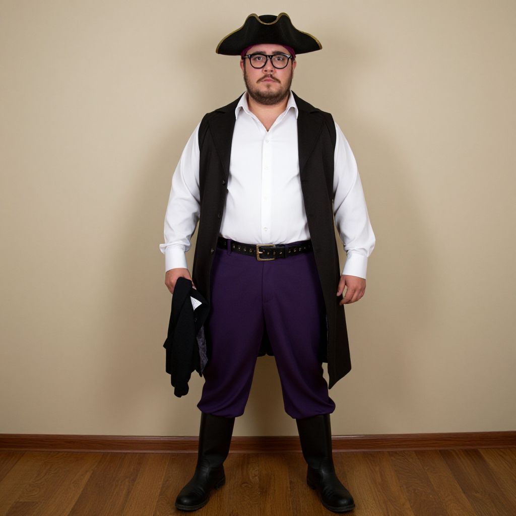 Photograph of a man standing against a plain, beige wall with wooden flooring. He has a beard and wears black-rimmed glasses, a black tricorne hat, white shirt, black vest, and dark blue pants. He holds a black jacket in his right hand. His outfit has a colonial or pirate-like style, and he wears black boots. The lighting is even, highlighting his attire and the wooden floor. The man's expression is neutral, and he stands confidently with his legs slightly apart.