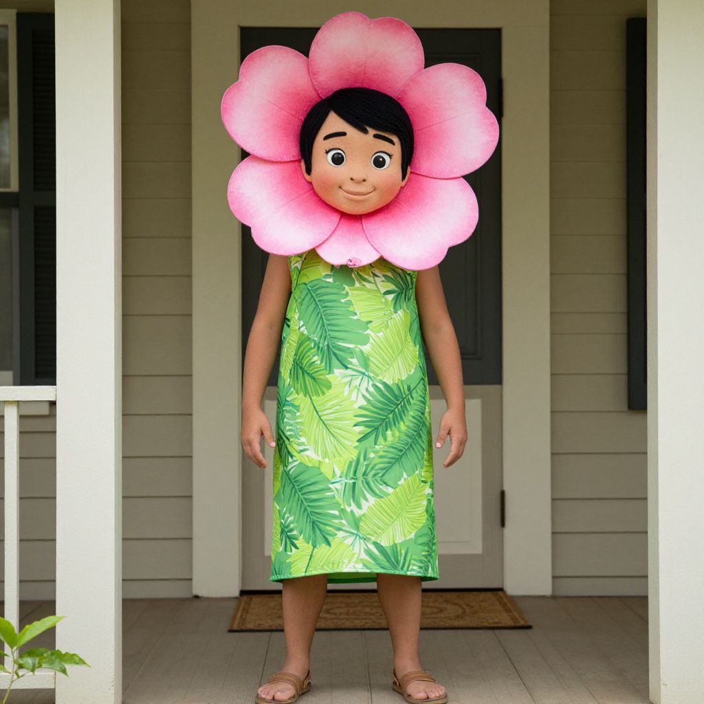 Photograph of a person with short black hair, wearing a bright green dress adorned with a leafy pattern, and a large, pink, inflatable flower headpiece covering their face. They stand on a porch with beige siding, white trim, and a brown doormat. The person's expression is cheerful, and they wear brown sandals. The background includes a window with dark blinds on either side of the door. The image has a playful, cartoon-like feel due to the oversized flower headpiece.