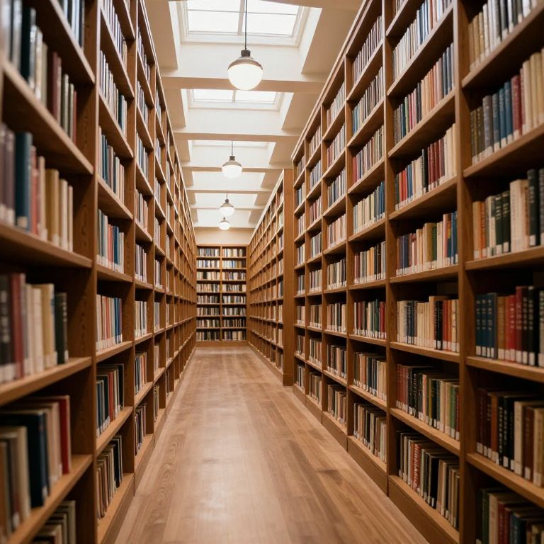 Imposing wooden bookshelves line both sides of a grand library corridor, stretching into the distance under a vaulted ceiling illuminated by skylights and pendant lights, creating a serene atmosphere where countless volumes rest in orderly rows.