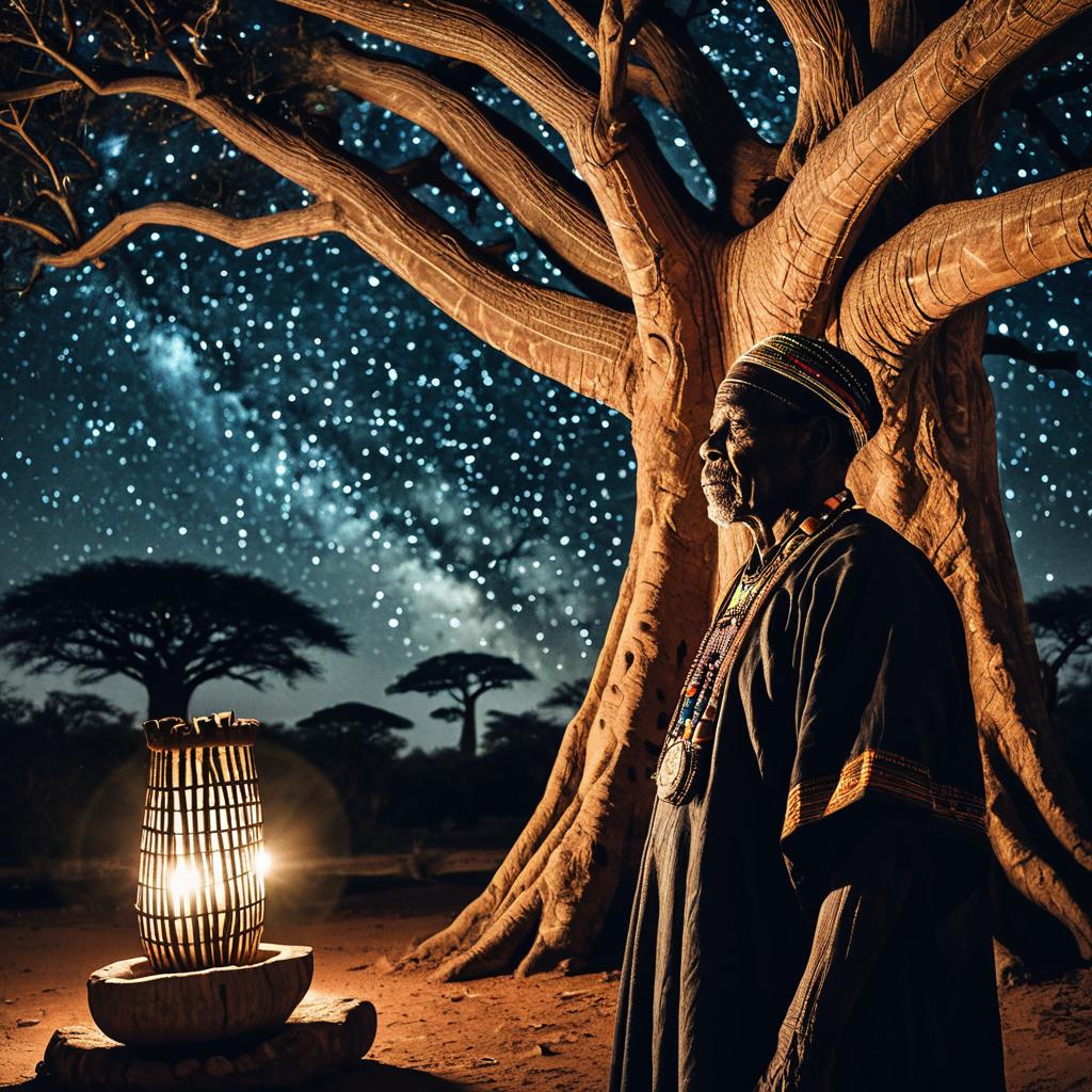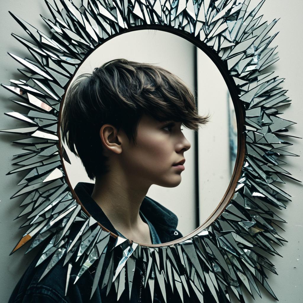 A striking and emotional depiction of an androgynous musician engaged in deep thought looking into an ambient room filled with hanging lanterns, with soft glowing lights harmonizing with shadows symbolizing self-discovery and transformation.