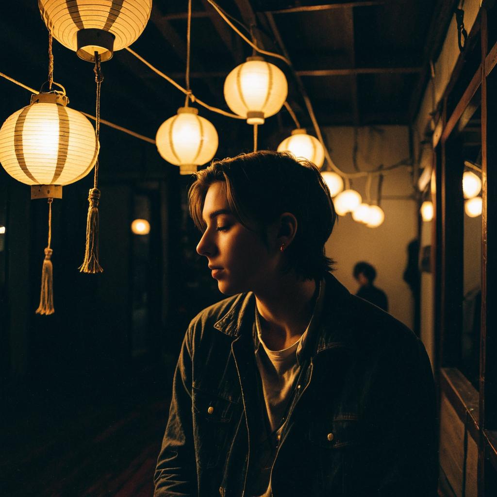 Portrait of an androgynous young adult musician with short hair, wearing a dark denim jacket and light-colored shirt, immersed in deep thought. The scene is set indoors with soft, warm, hanging paper lanterns casting a glowing light that creates a harmonious balance of light and shadow, evoking themes of self-discovery and transformation.