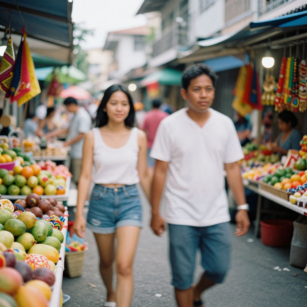Vibrant street scene, Lomography style, saturated colors, dreamy light leaks, blurred motion, shallow depth of field, man & beautiful Philippines woman, walking hand in hand, amidst colorful stalls, exotic fruits, traditional crafts, lively atmosphere, urban culture, warm sunlight, soft focus, film grain effect. Man has masculine face and piercing eyes