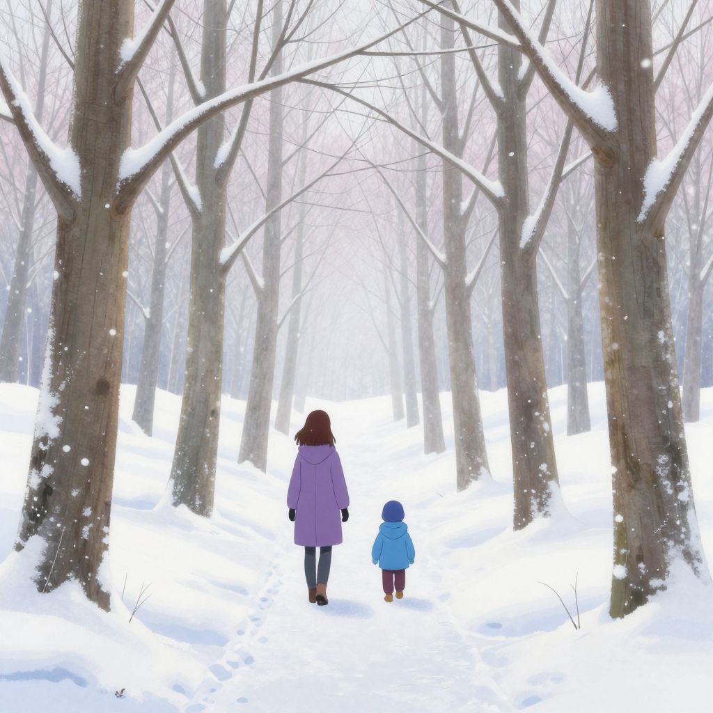 A serene winter landscape rendered in a delicate anime style, featuring two figures—a woman in a purple coat and a child in blue—walking through a snow-covered forest with bare trees and soft, diffused lighting, evoking a tranquil and dreamlike atmosphere.