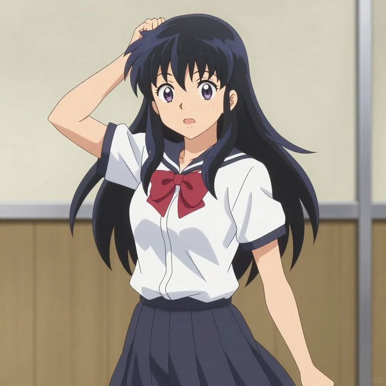 Portrait of an anime girl with long dark hair and purple eyes, wearing a white and navy blue Japanese school uniform with a red bow. The character is inside a classroom setting with wooden paneling in the background, posing with one hand touching her hair. The style is typical of anime and manga artwork.