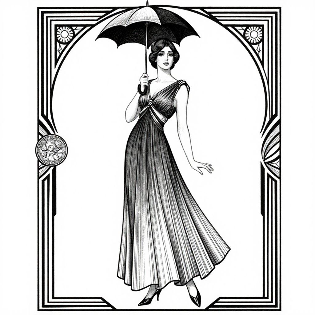 This is a black-and-white digital drawing in an Art Nouveau style. It features a woman with short, wavy hair, wearing a floor-length, sleeveless, dark dress with a cinched waist, and holding a black umbrella. Her dress has a delicate, flowing texture. She stands in an elegant pose, with one hand lightly resting on her hip and the other holding the umbrella. The background is framed with intricate, geometric patterns, and there's a small, decorative fan on the left side. The woman wears high-heeled shoes and has a confident, poised expression. The image has a vintage, elegant feel.