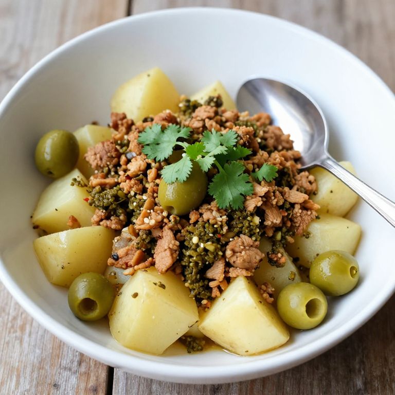 Paleo-inspired dish served in a white bowl featuring crumbled pork green chile atop a bed of diced potatoes, garnished with vibrant green olives and fresh cilantro, accompanied by a metallic spoon resting inside.