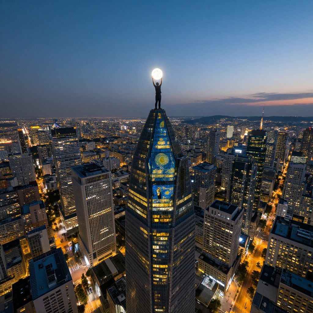 A captivating image depicts an eagle's aerial view over a vibrant cityscape at twilight, reminiscent of Van Gogh's swirling skies in \"Starry Night.\" Towering skyscrapers reflect the dynamic hues of blues and golds against the backdrop of dusk. In this urban symphony, a solitary figure stands atop the highest structure, bathed in lunar light as they hold an ethereal sphere that seems to govern time itself. This enigmatic scene masterfully blends natural splendor with human ingenuity, evoking a sense of awe and intrigue within a rich emotional spectrum spanning across space and time.
