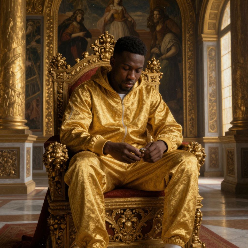 In this hyperrealistic renaissance painting, a black man in a tracksuit sits contemplatively on a throne within a grand palace interior. The golden hour light filters in from the right, casting a warm glow that highlights the intricate details of the ornate, renaissance-style painting on the wall behind him. The man's golden hoodie and tracksuit contrast sharply with the rich, dark tones of the palace, creating a striking visual balance. His hands, rendered with meticulous detail, hold a small object, adding a sense of intrigue to the scene. The soft focus and specks of dust in the air enhance the painterly quality, while the soft shadows and hyperrealistic brushstrokes bring the scene to life. The composition is masterfully arranged, with the man positioned centrally, drawing the viewer's eye into the depth of the palace, where the golden columns and intricate carvings create a sense of grandeur and mystery.