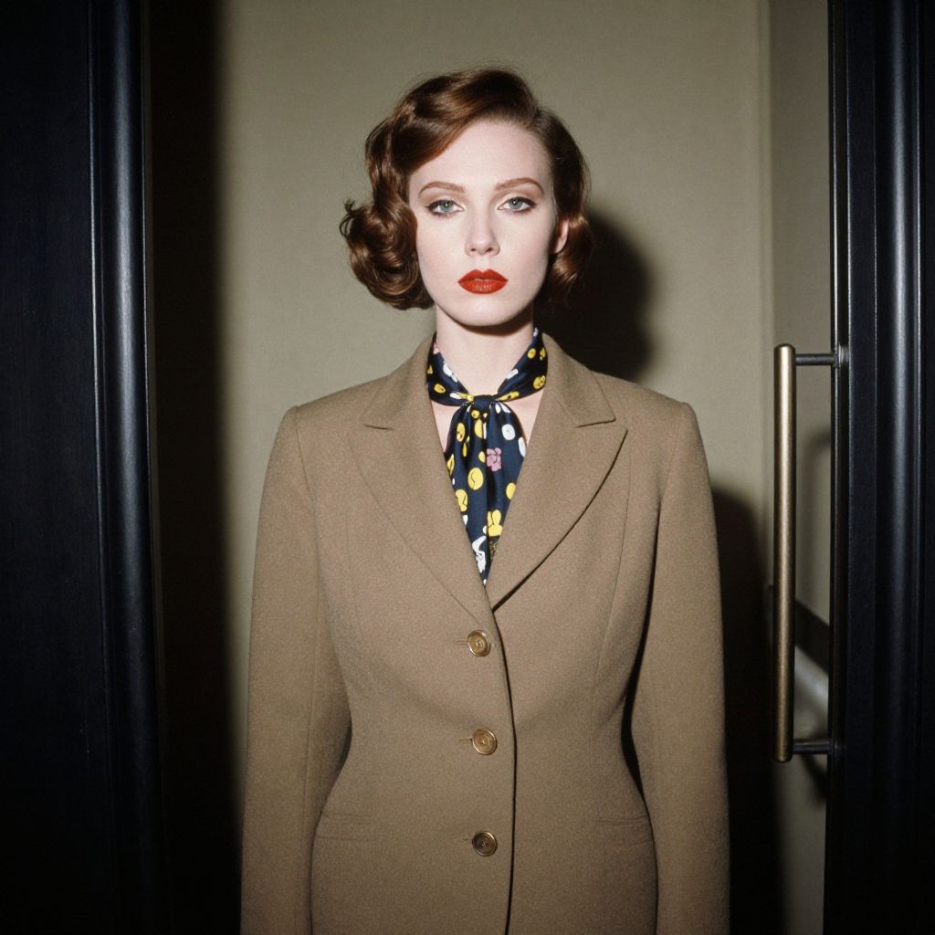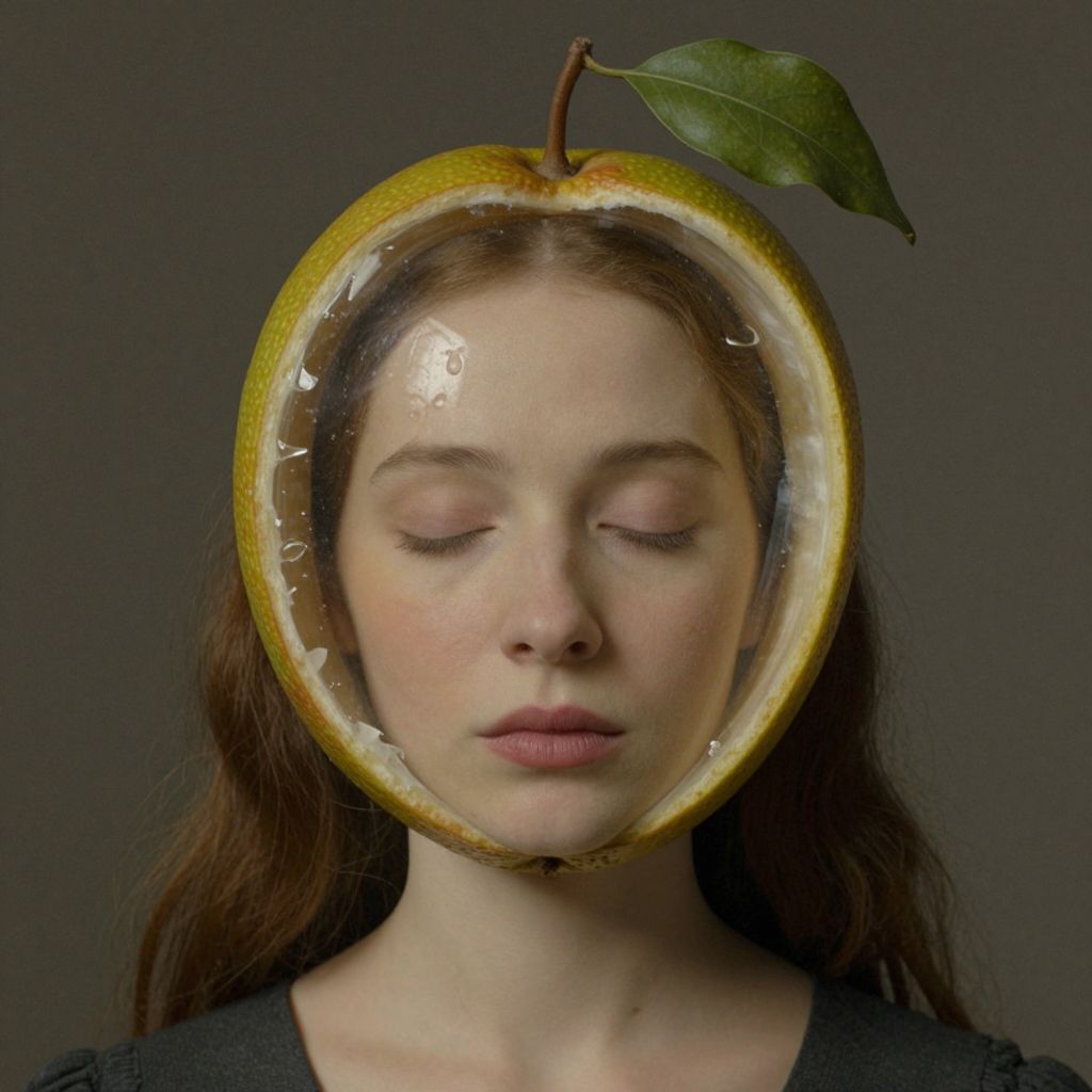 Photograph of a young woman with fair skin and long brown hair, wearing a beige, double-breasted, knee-length coat over a white blouse, and brown pumps. She stands against a plain, gray backdrop, with a large, green apple at her feet, featuring a subtle, melancholic facial expression. The floor is dark and textured, contrasting with the smooth, gray background and the shiny green apple. The woman's expression is neutral, and she stands slightly off-center, with her arms relaxed at her sides. The overall style is surreal and somewhat whimsical.