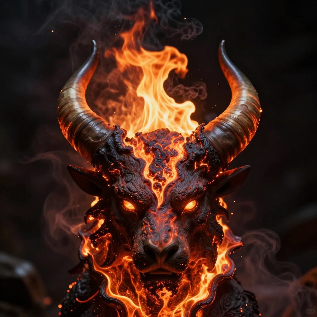 Close-up of firey horns curling upward, glowing with molten lava-like textures, set on the head of a mythical beast, with glowing eyes and smoky dark surroundings