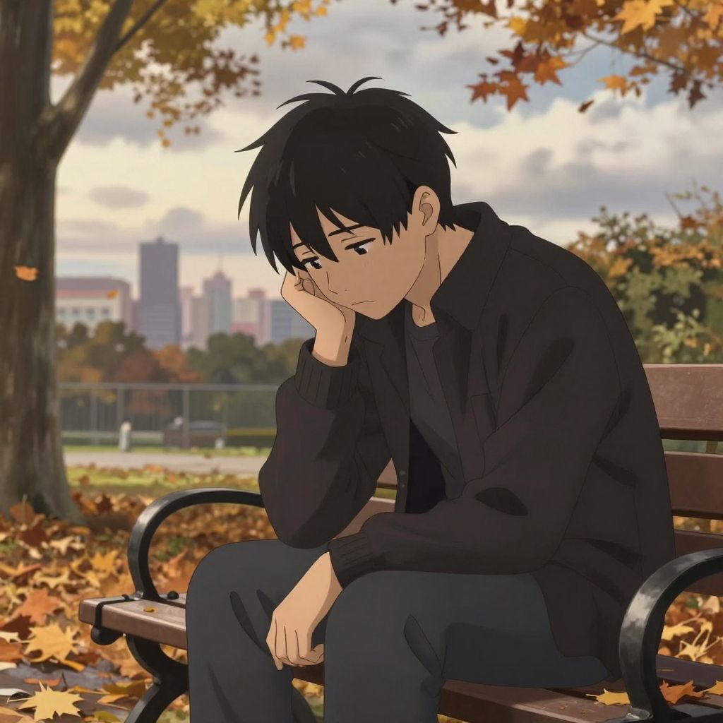Anime boy depressed sitting alone on a rooftop at sunset, tears in his eyes, detailed urban background, soft pastel colors, emotional atmosphere, cinematic lighting