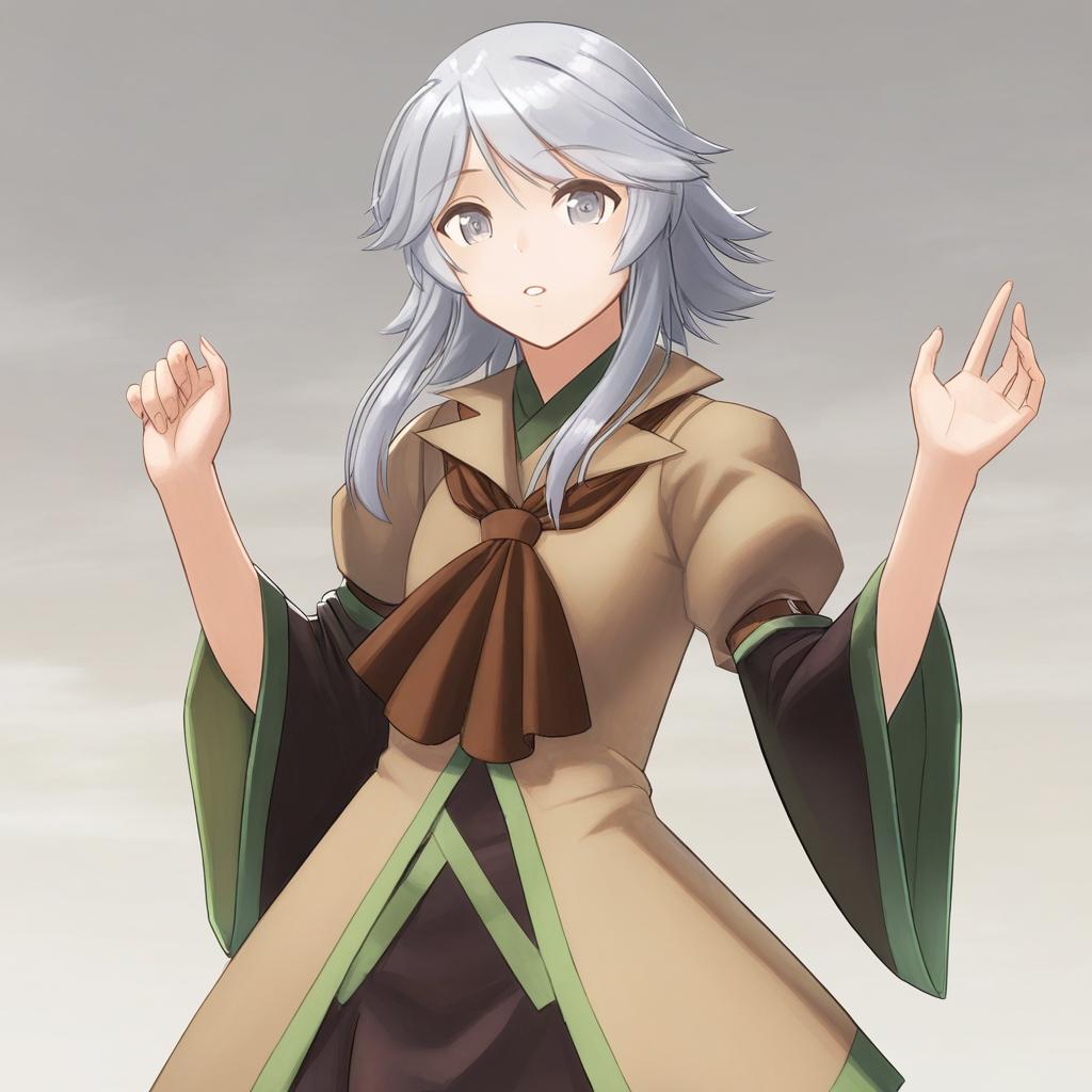 Houlen yabusame, len'en, 1other, grey eyes, grey hair, short hair, short hair with long locks, brown coat, short over long sleeves, puffy short sleeves, wide sleeves, ascot, by artist tantaka, leet