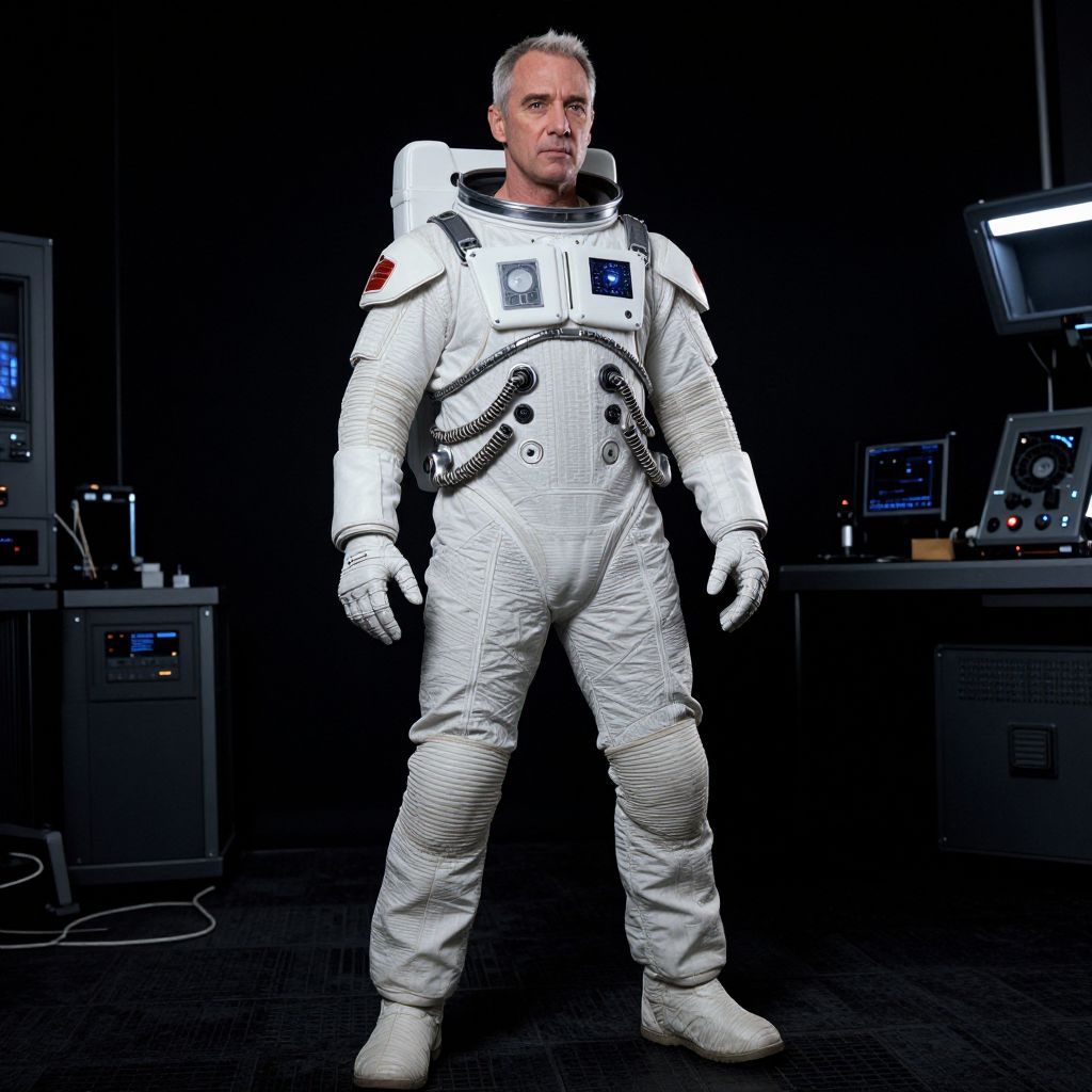 Photograph of a middle-aged white man with short gray hair, standing confidently in a white, full-body astronaut suit. The suit has a bulky, padded texture, with black straps and buttons, and an American flag patch on the left chest. He wears white gloves and boots. The background is dark, with dimly lit control panels and monitors on either side, suggesting a space mission control room. The lighting highlights the suit's texture and the man's serious expression. The setting creates a realistic, professional space exploration atmosphere.