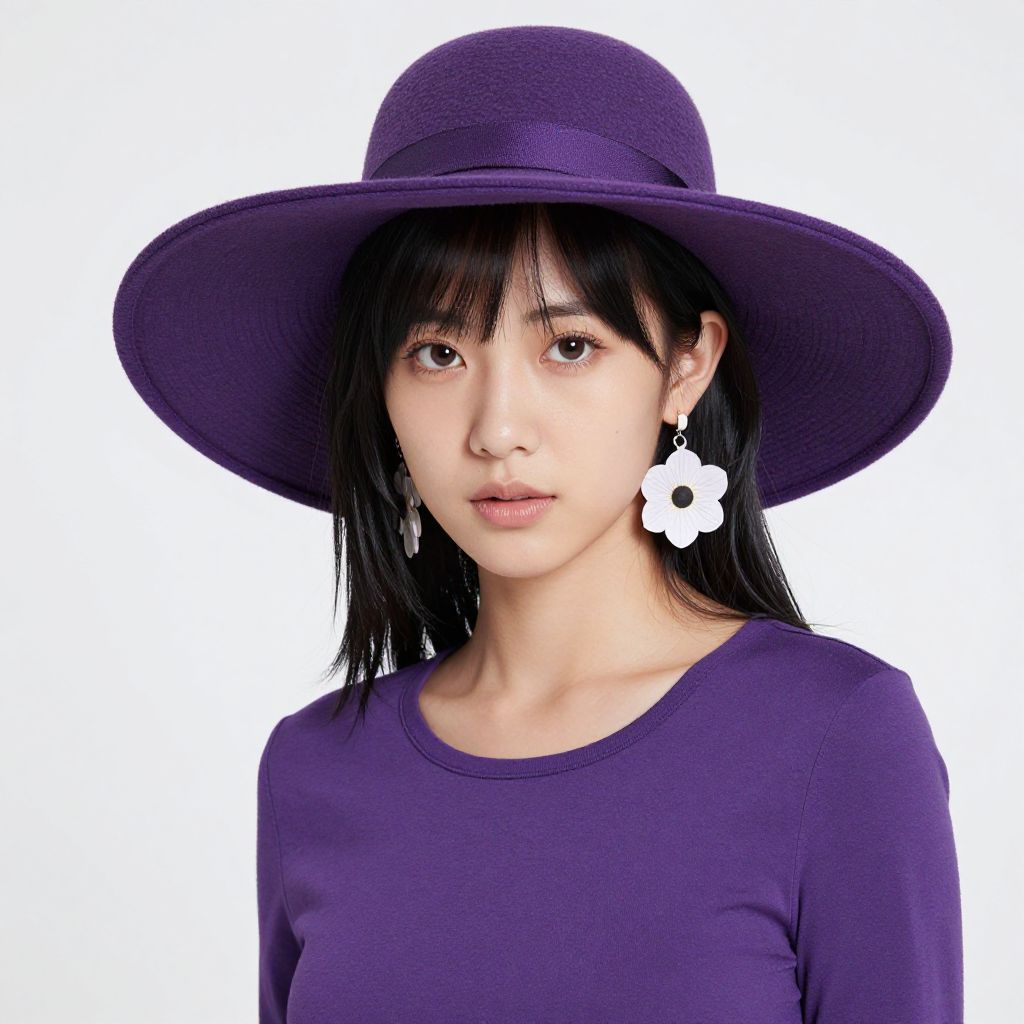 "purple rain apollonia, solo, hat, jewelry, black hair, earrings, 1girl, flower, looking at viewer, white background, simple background, realistic, long sleeves, upper body Realistic photo of casual sexy person with pretty face"
