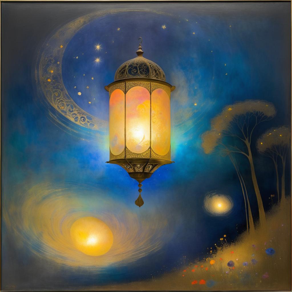 Charcoal painting by Odilon Redon depicting a floating lantern with flickering light, with radiant colors, delicate filigree, and swirling shadows, in a dreamy nightscape, with a magical and ethereal mood, highly imaginative and symbolic