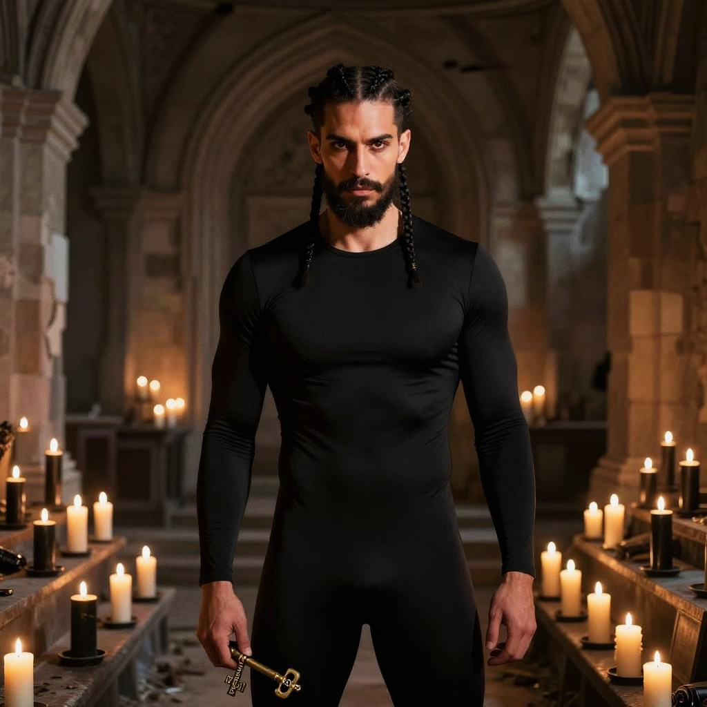 A young woman with amber eyes wearing a black tight bodysuit stands in an abandoned gothic library. She holds an ancient leather-bound book in her hand, surrounded by rows of lit black candles at varying heights. The scene is captured with cinematic lighting and a moody atmosphere.
