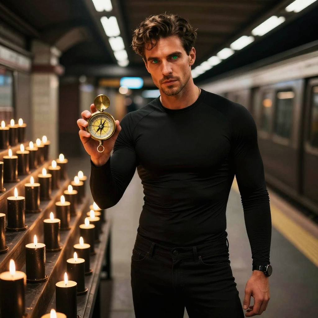 Night Photography a highly detailed cinematic photo of young woman with amber eyes in abandoned gothic library with rows of lit black candles at different heights. She holds ancient leather-bound book in her hand. She wears a black tight bodysuit, 35 mm lens, f/2.0, accent lighting, global illumination, Canon EOS R5