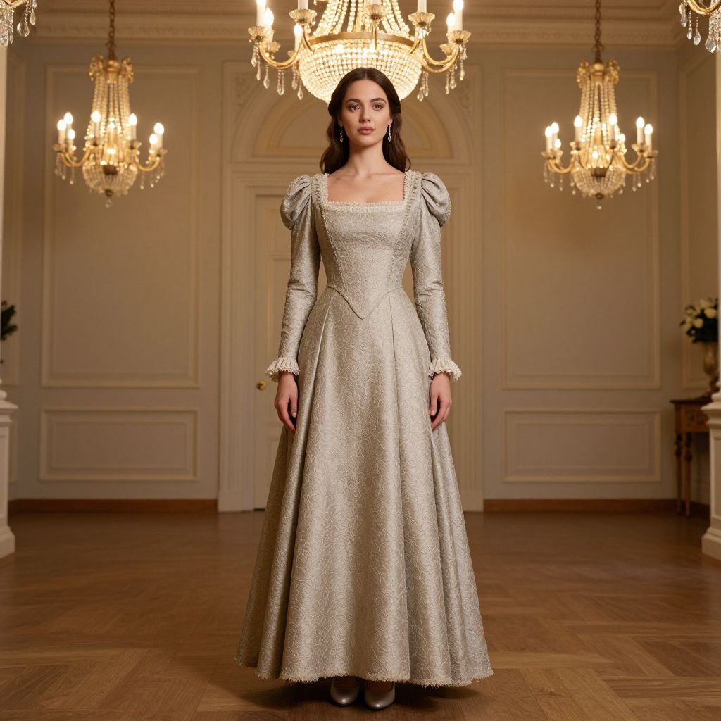 Photograph of a woman standing in an opulent, well-lit room with chandelier lighting. She wears a long, silver, intricately textured gown with puffed sleeves and a square neckline. Her dark brown hair is styled in soft waves. The background features cream-colored, paneled walls and a polished wooden floor. Two elegant chandeliers hang from the ceiling, casting a warm glow. A small, dark wooden table with a vase of white flowers is visible on the right. The woman's expression is neutral, and she stands with her arms relaxed at her sides.