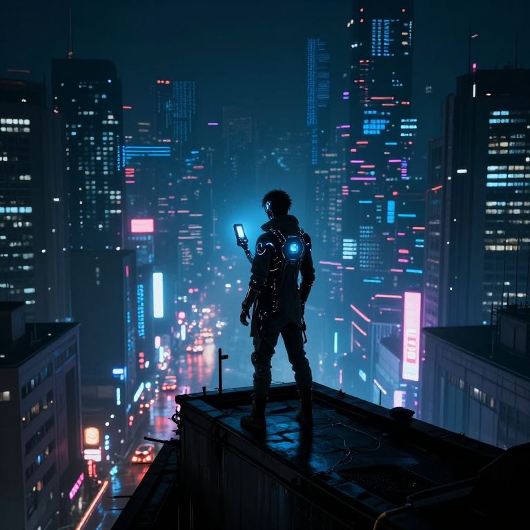 Denwa0214 in a futuristic cyberpunk city at night, neon lights reflecting on wet streets, digital glitches fading in the background, a lone figure standing atop a rooftop with a glowing device in hand, cybernetic elements blending with urban decay, high detail, volumetric lighting, cinematic composition, MidJourney style