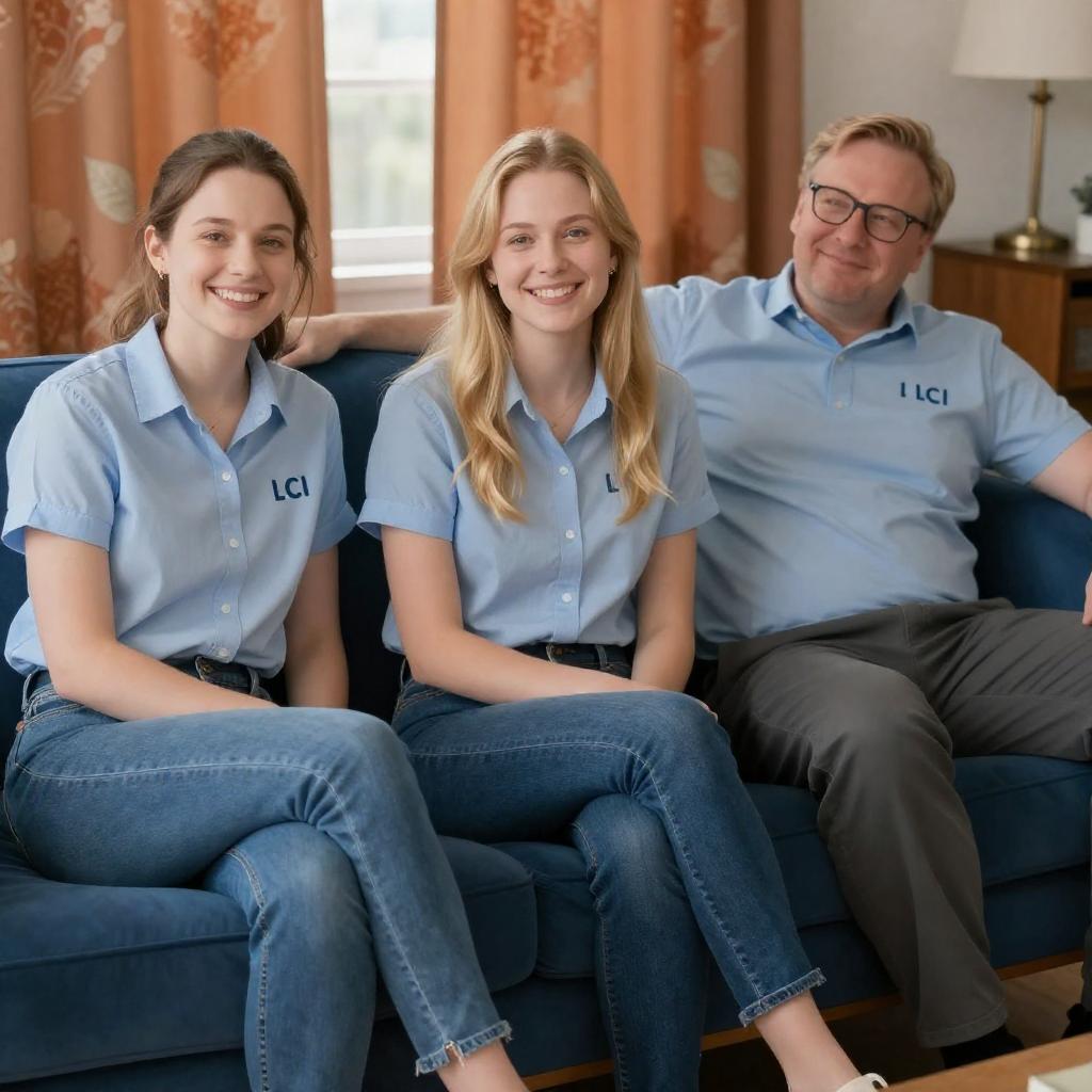 Three people sitting on a dark blue couch. Two women and one man, all wearing light blue button-up shirts with "LCI" s. Blonde woman in center smiling, left woman with light brown hair smiling, man with glasses and light hair leaning back. Background: orange floral curtains, wooden furniture, lamp. Casual, indoor setting.