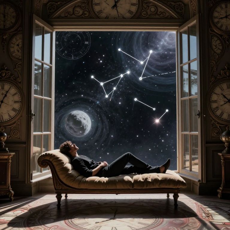Photograph-style image of a person lounging on an ornate chaise, gazing at a starry galaxy through open windows. Clocks frame