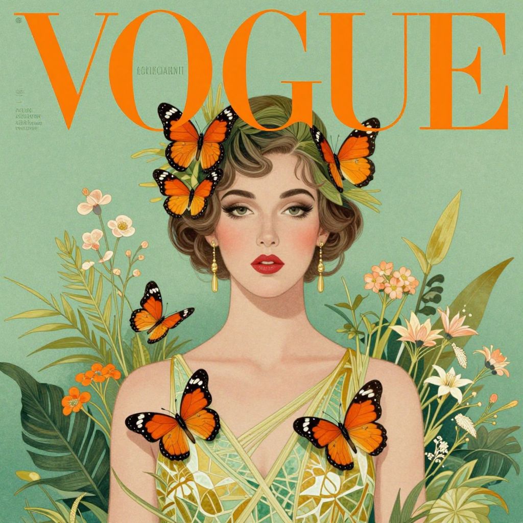 This digital illustration features a fair-skinned woman with short, wavy brown hair adorned with orange and black butterflies. She wears a sleeveless, green, geometric-patterned dress with gold accents, and gold, dangling earrings. Her red lips stand out against her pale complexion. Surrounding her are various green leaves, white and orange flowers, and more orange butterflies. The background is a light teal color with the word "VOGUE" in large, orange, uppercase letters at the top. The style is reminiscent of vintage Vogue magazine covers, with a modern, digital art twist. The image is crisp and vibrant, emphasizing the contrast between the woman's dress and the natural elements.
