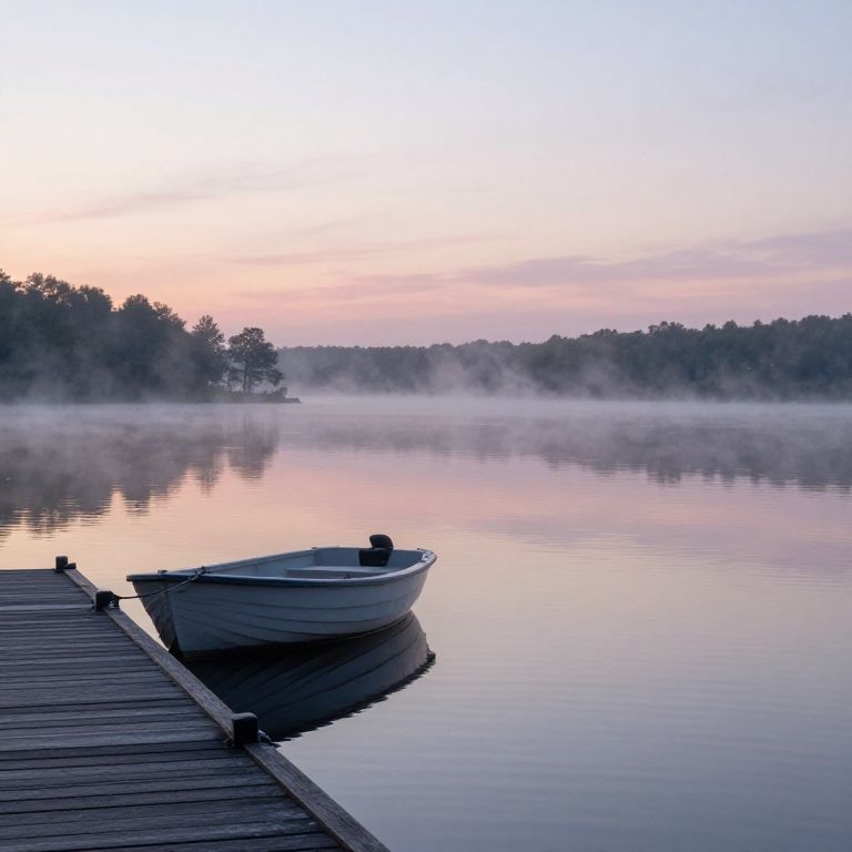 Photograph of a tranquil lake at dawn, with a small, empty rowboat moored on a wooden dock, surrounded by mist. Soft pink and