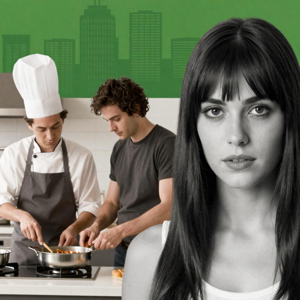 Photo of a movie poster featuring two men cooking together in a modern kitchen; one man wearing a white chef's uniform and hat, the other in a casual dark t-shirt. On the right side, there is a black-and-white close-up portrait of a woman with long dark hair and bangs, looking directly at the camera. The background is green with an illustrated cityscape silhouette.