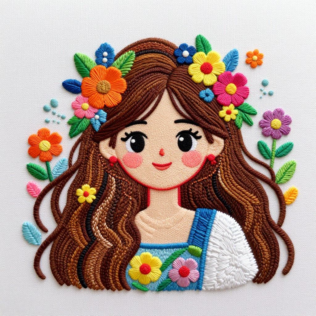 A vibrant portrait embroidery artwork featuring a detailed depiction of a young woman with flowing brown hair adorned with colorful flowers, set against a delicate floral background, showcasing intricate hand-stitching techniques and a whimsical, cartoon-inspired aesthetic.