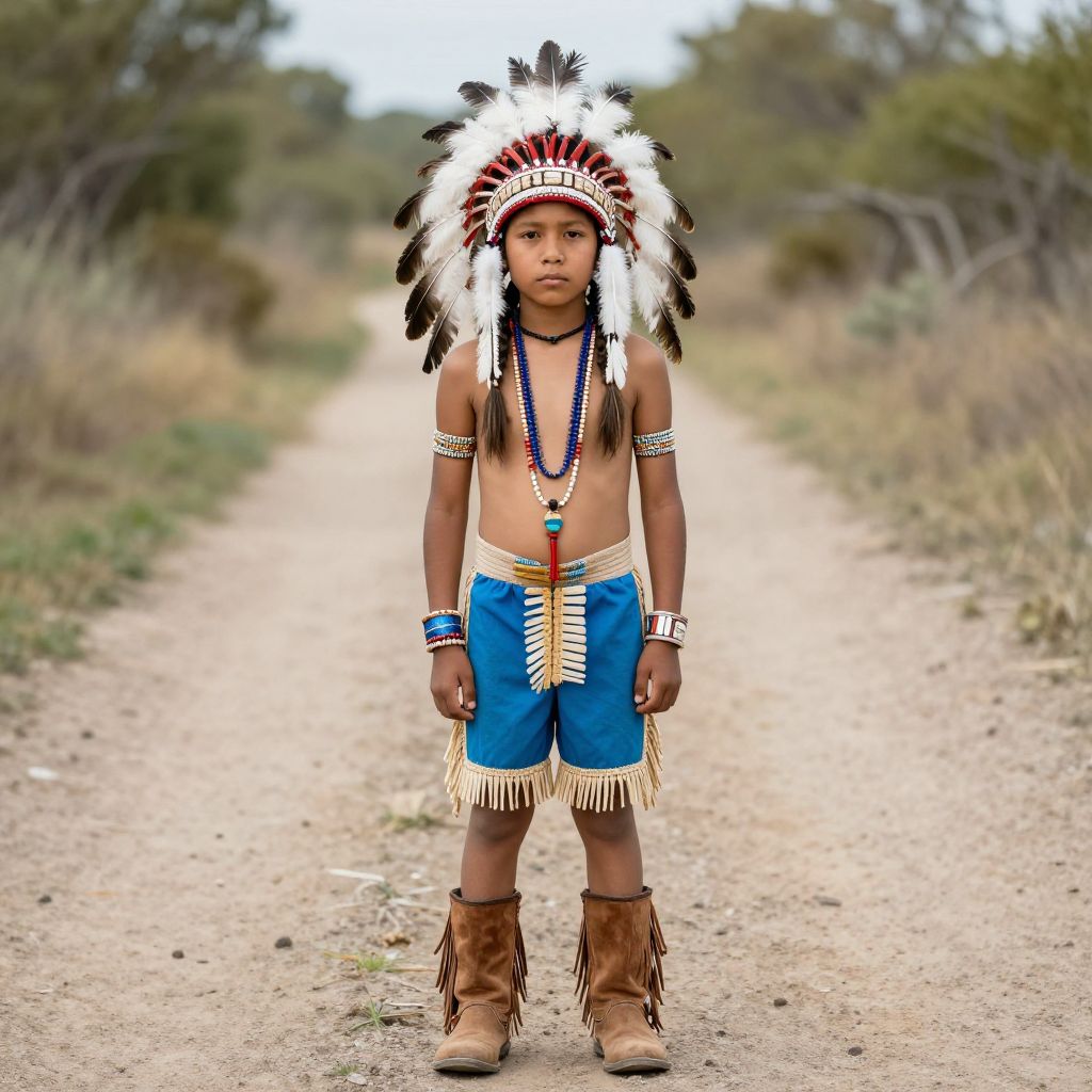 Photograph of a young boy standing on a dirt path, wearing a Native American headdress, blue fringed shorts, brown boots, and beaded