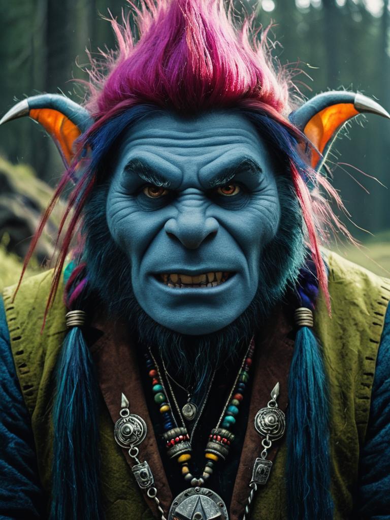 Man in Troll Costume, cinematic realism, colorful fantasy portrait