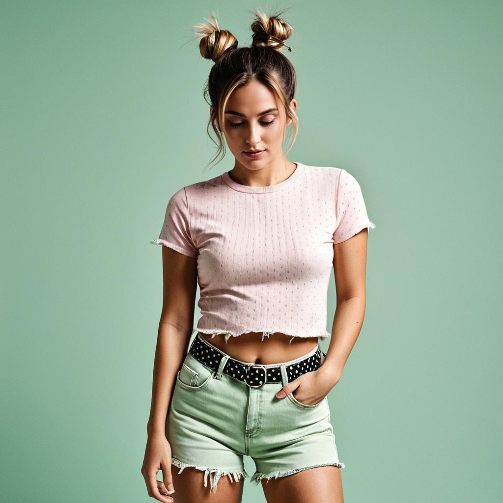 Woman, casual contemporary, pink ribbed crew-neck t-shirt, short sleeves, pale green high-waisted denim shorts with frayed hem, white belt with black polka dots, metallic buckle, natural makeup, messy bun hairstyle, light-filled studio background with subtle shadow play.