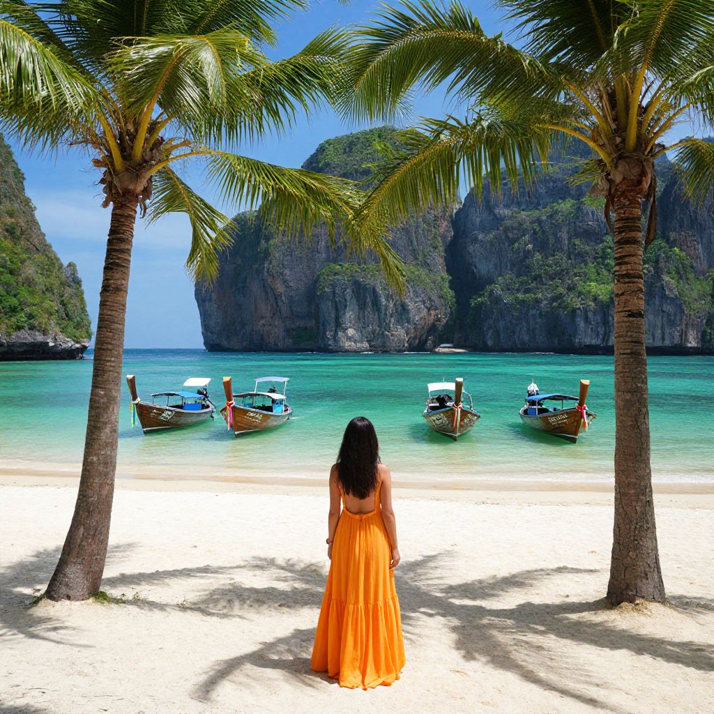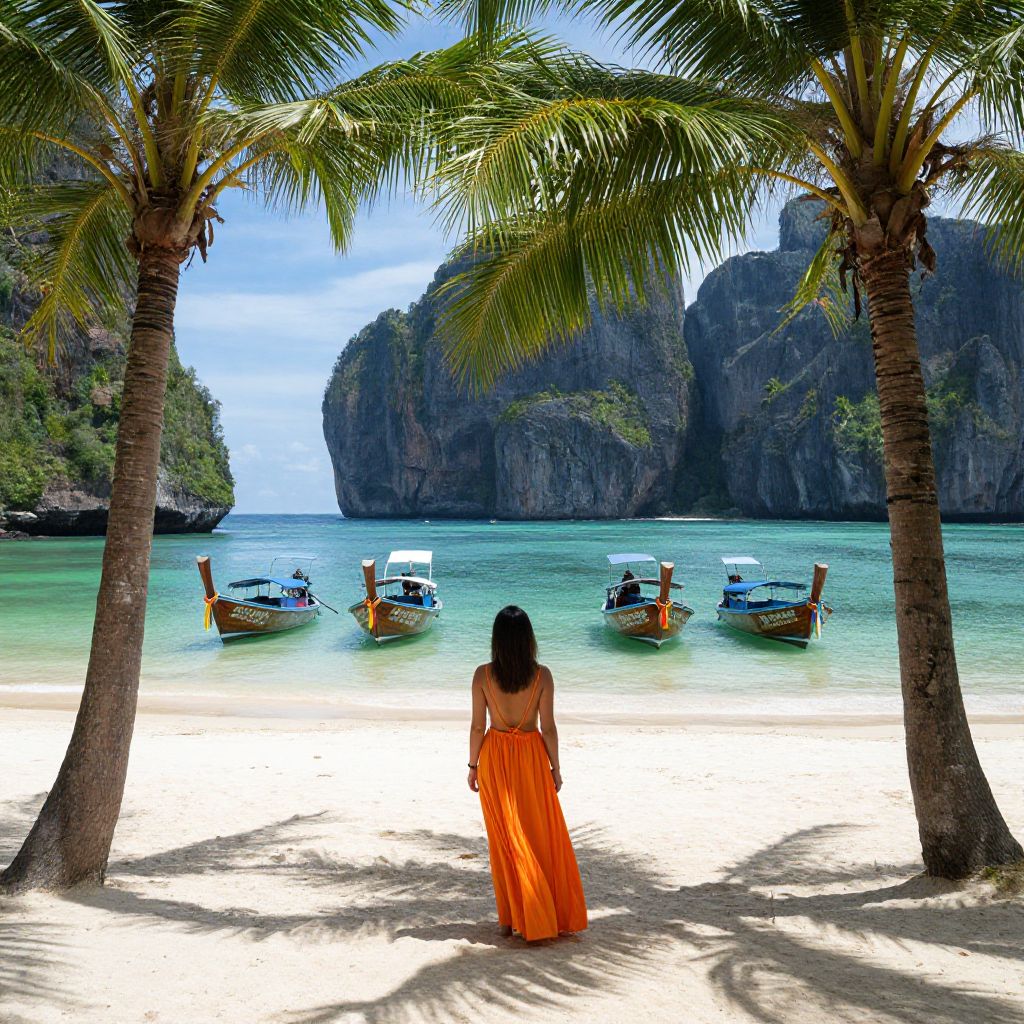 Woman in vibrant orange dress stands on pristine sandy beach framed by towering palm trees, gazing at turquoise waters dotted with four colorful longtail boats heading toward majestic limestone cliffs under a bright blue sky in Phuket.